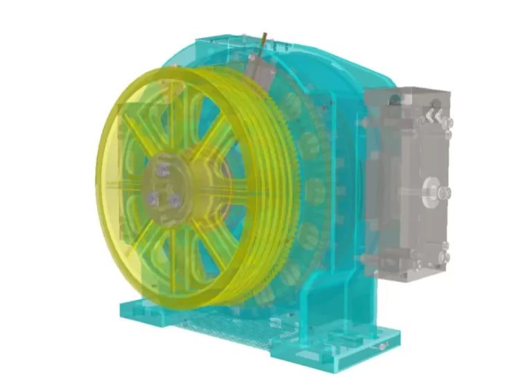 "تشغيل صامت، سلس ومريح" "يعمل المحرك اللامعدني (Gearless) بقوة كهرومغناطيسية وبسرعة منخفضة دون تلامس ميكانيكي، مما يلغي الاحتكاك والاهتزازات والضوضاء الناتجة عن صندوق التروس أثناء عملية النقل، ويضمن تشغيل المصعد بانسيابية تامة."